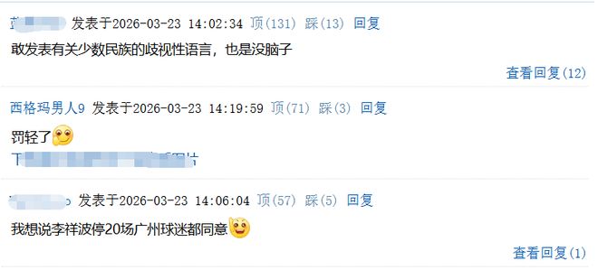 而对于这次处罚,球迷们也给出了不同的看法,评论区主要分为两派,一部分球迷认为对李祥波处罚还是太轻了:敢发表有关少数民族的歧视性语言,也是没脑子;我想说李祥波停20场广州球迷都同意;罚的太轻了这不是第一次都已经第二次了还这么给人家挠痒痒还会有下次的。