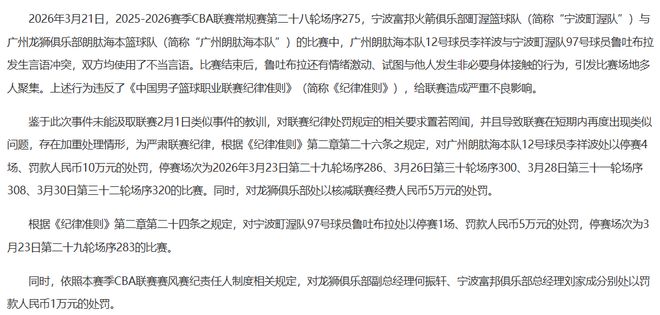 没想到,一次不算大规模冲突的赛后纠纷,居然会引来CBA联赛的超级重罚,北京时间3月23日,CBA联赛开出了一张重磅罚单,分别对李祥波、鲁吐布拉、广州龙狮、浙江宁波这2家俱乐部以及两队的总经理处以了重罚!