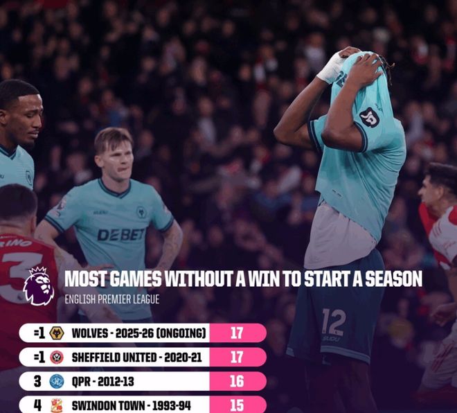 本轮0-2告负后,狼队在英超遭遇耻辱性的10连败。17轮过后狼队2平15负仅积2分,未尝一胜,这一糟糕表现,也追平谢菲尔德联在2020-2021赛季创下的英超历史开局最长不胜纪录。